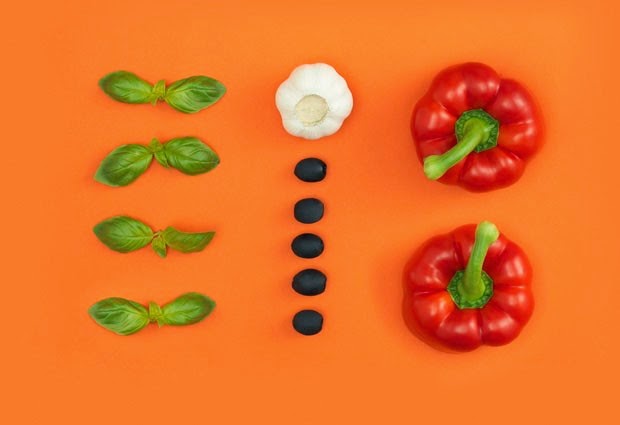 As fotografias foram feitas em dupla. Uma com os ingredientes a serem utilizados na receita, e outra com o prato já pronto. Tudo para servir de inspiração aos clientes, uma forma de incentivar a criatividade na hora da apresentação da comida.